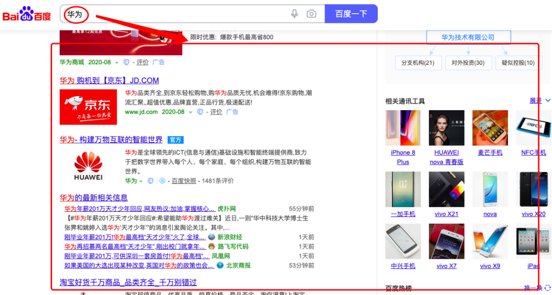 04图:百度PC搜索华为,展示圈中即结果页