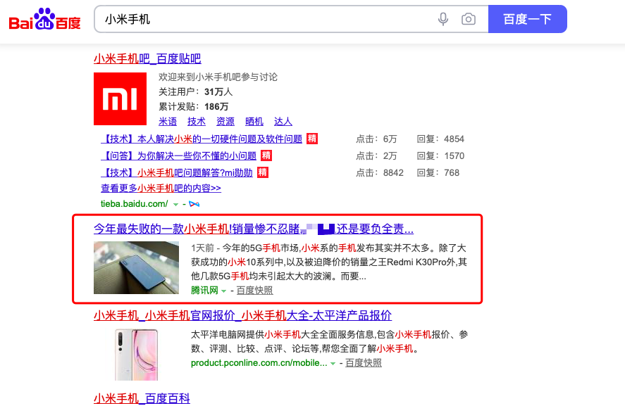 05图:百度搜索小米手机出现的新闻,当然截图是不那么好消息,按理说公关应该发些好的新闻,纯截图,无恶意,截图于2020.8.5下午5点
