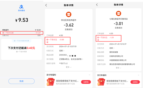 青岛的多家商超也紧随其后,引入了这一新潮支付方式。记者在几次小额交易实测中体会到其便捷性,它告别了“解锁-打开App-出示/扫描二维码-确认”的繁琐步骤,仅需简单解锁手机和轻触商家的NFC收款设备,两个步骤即可完成交易。更令人欣喜的是,使用“碰一碰”支付还能享受一定的优惠,有时是几毛钱,有时一块多。但优惠金额与实付款的关系不大,并不会随着商品总价的增加而提高。