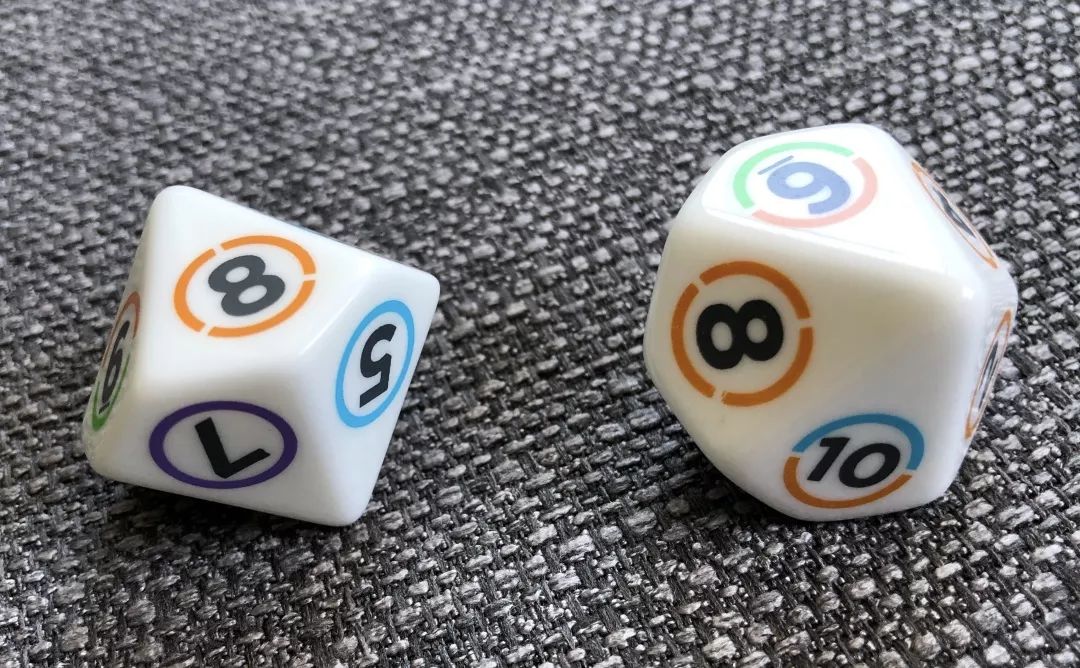 骰子有2个,简单,但是很特别。咱们平时用的骰子一般是6面,而这两个骰子都是10面的,分别表示1-10这10个数字: