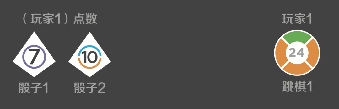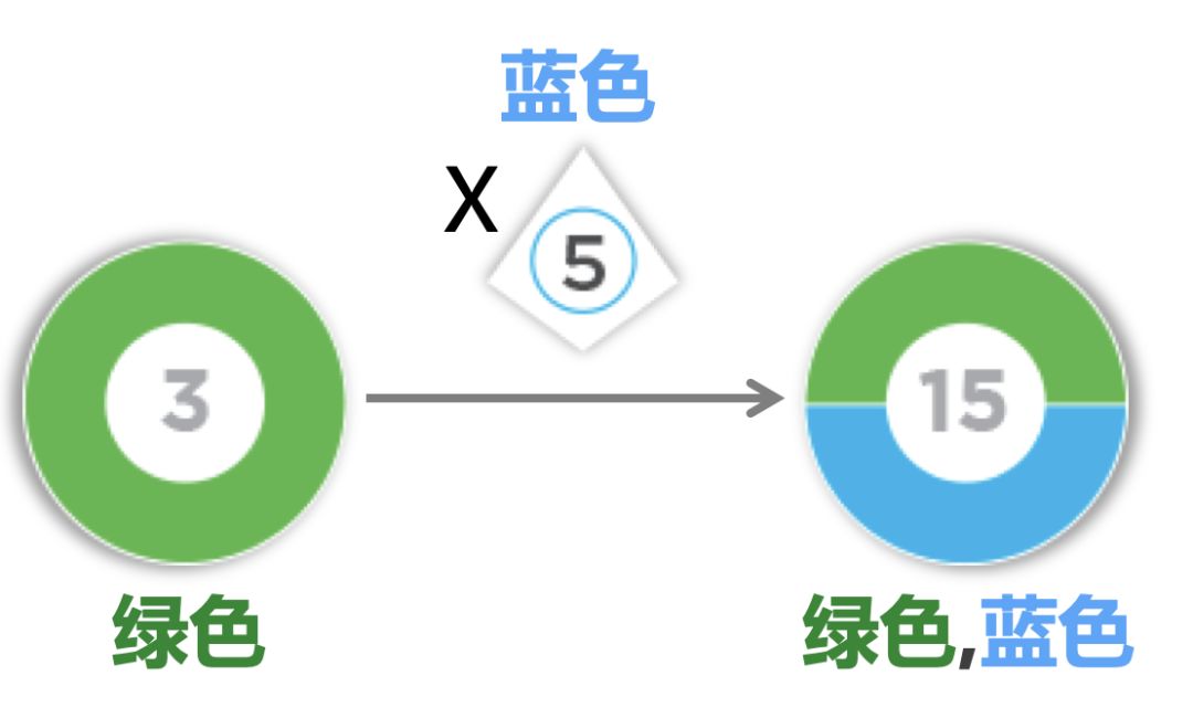 比如,你的跳棋1位于3的圆点上,骰子掷出来的数字是5,你选择在3的基础上乘以5。每次使用乘法,相乘的两个数字的颜色会被合并。请注意3是绿色的,骰子上的5是蓝色的,这意味着,他们的结果15将会是绿色和蓝色。而15在唯一一个恰好只有这两个颜色的位置。