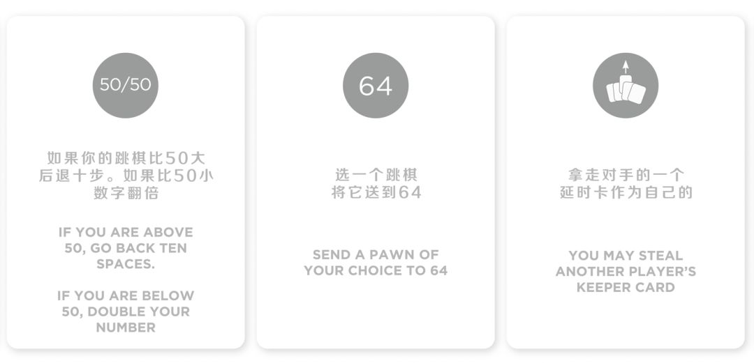 当你结束了你的移动阶段之后,如果你的任一跳棋降落在完全红色(质数)的圆点,那么你可以抽一张技能卡。