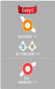 再比如这一道,现在的位置是“4”,骰子为5,8,怎么跳到目标17?是不是跟我们一开始提到的数学题一模一样?