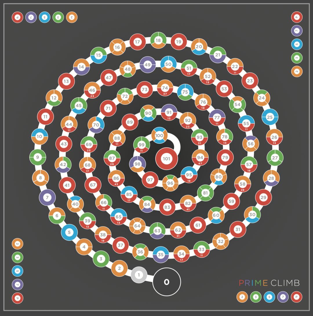 Prime Climb的棋盘是从0到101的彩色圆圈,很有艺术感,但那可不是只为了好看而已,它的棋盘、骰子上每一个数字的每一种颜色构成,都有特别含义!