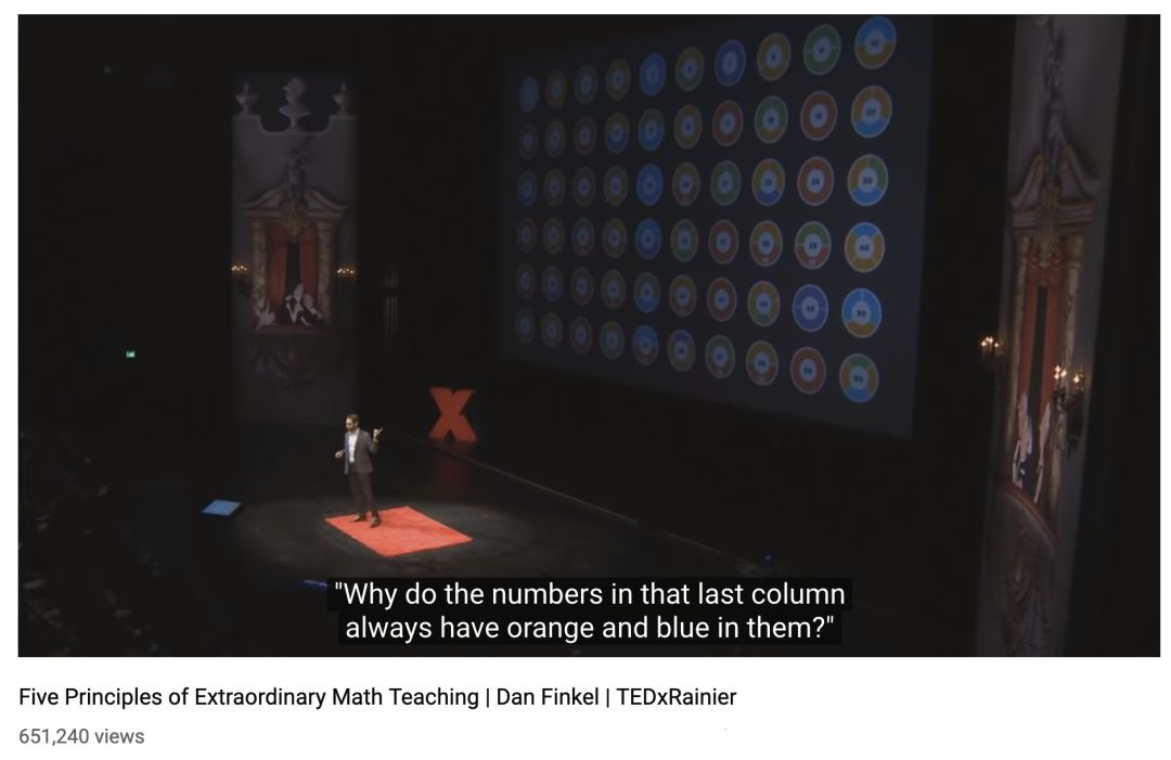 它的创始人之一,Dan在Ted上的演讲——“Five Principles of Extraordinary Math Teaching”(优秀数学教育的5个原则),在Youtube上有65万多的观看量,对美国数学教育有非常深远的影响。