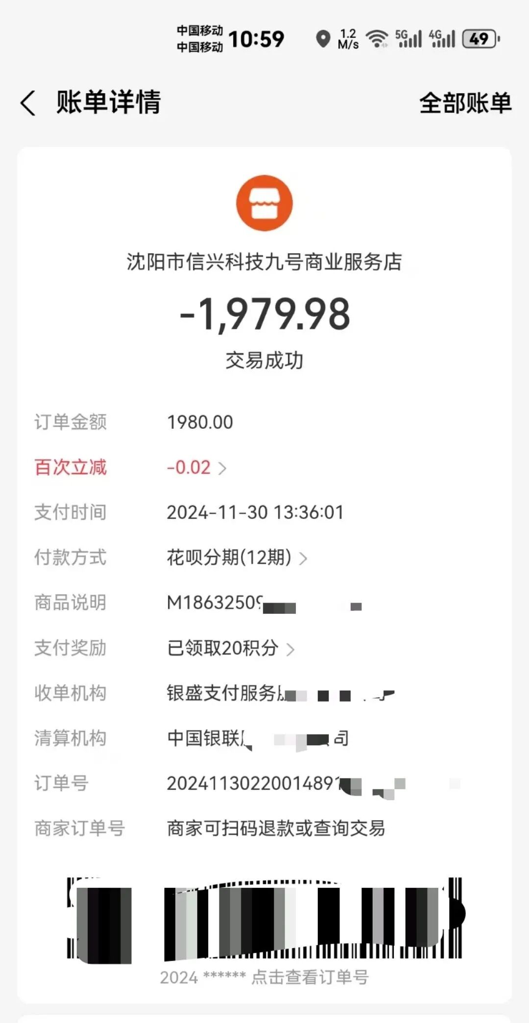 店主发现被“花呗”支付1980元