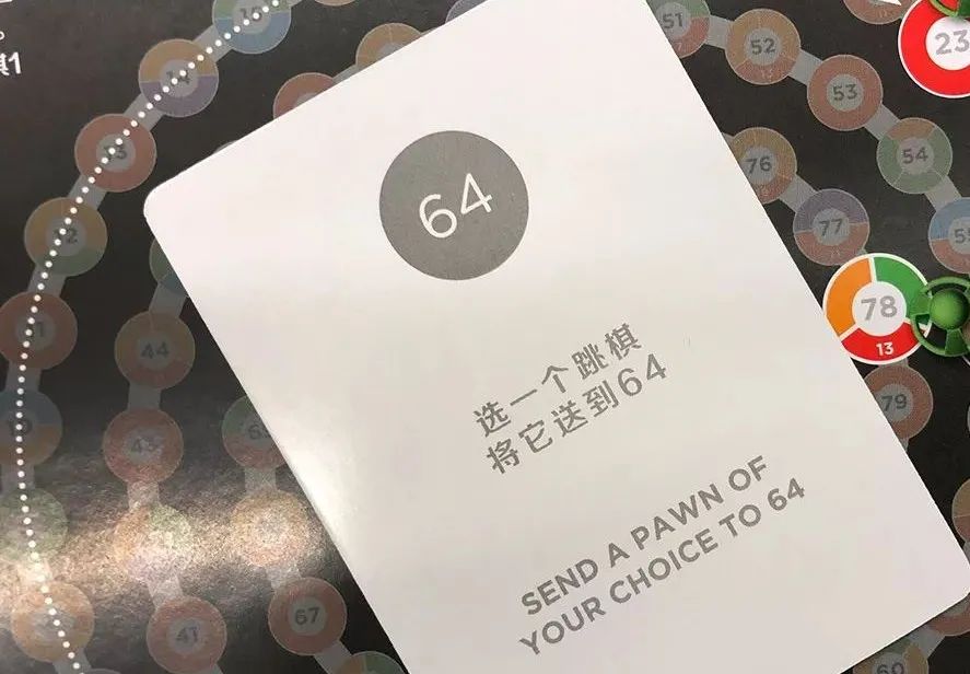 c.此时你落在了全红色的23,是个质数,还可以抽取一张技能卡牌。比如这时抽到一张即时牌,可以“选一个跳棋,将它送到64”,那么,就可以把位于23的跳棋跳到64啦!