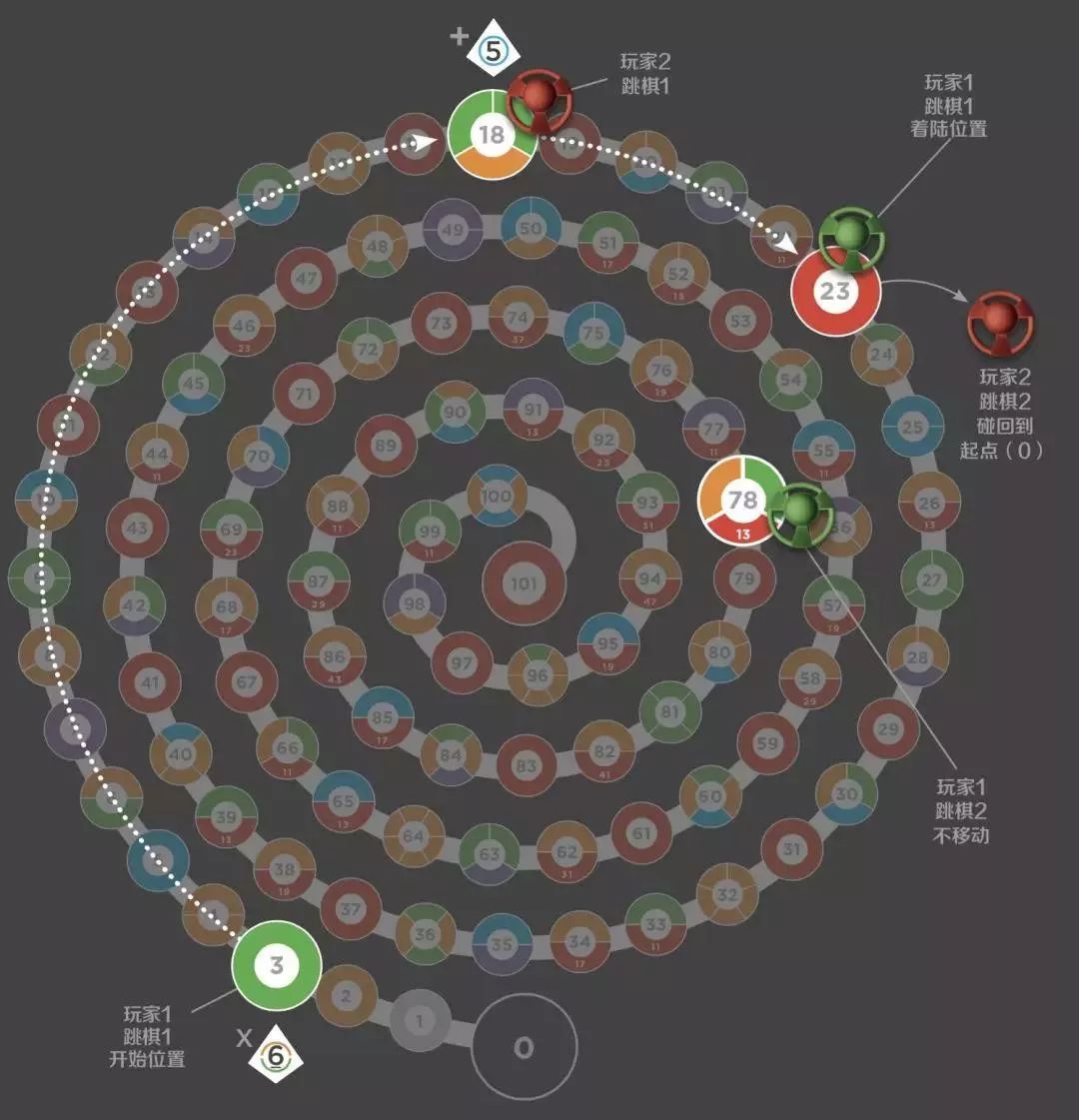 如果你的跳棋最终落脚位置上有其他跳棋,把这个跳棋送回到起点0。不过这也意味着,如果你选择了一种糟糕的计算方案,可能会把自己的另外一个跳棋碰回起点0。