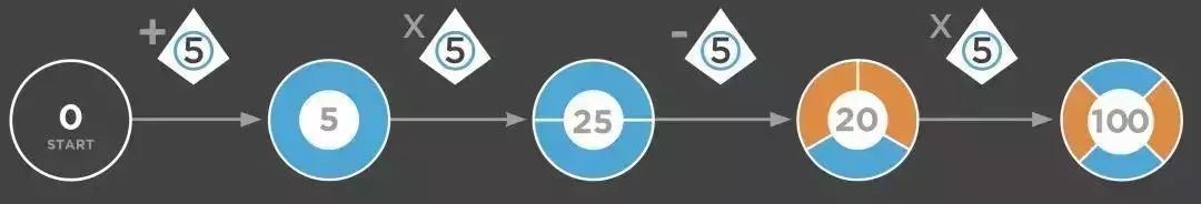 加上5:将跳棋从起点0挪动到5。 乘以5:将跳棋从5挪动到25。 减去5:将跳棋从25挪动到20。 乘以5:将跳棋从20挪动到100。