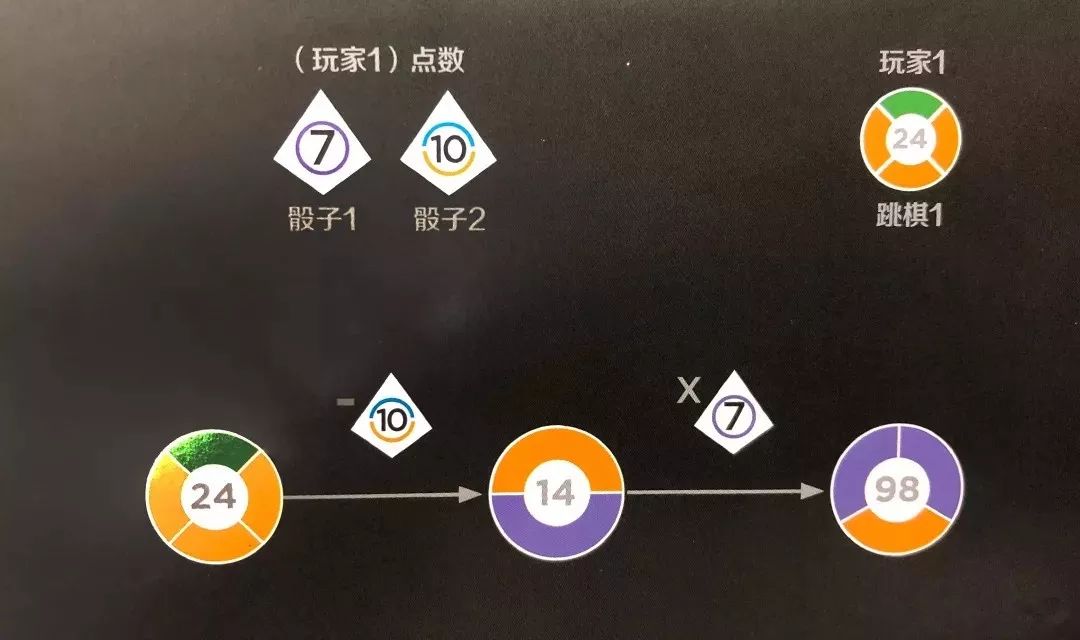 用跳棋所在位置的数与骰子上的数做加、减、乘、除运算的方式,来移动跳棋。把跳棋移动到计算后得到的数字位置上。你可以每个跳棋移动一次,或者其中一个跳棋移动两次。如果你有延时卡,你可以选择在摇骰子前、中、后使用延时卡上的指令。
