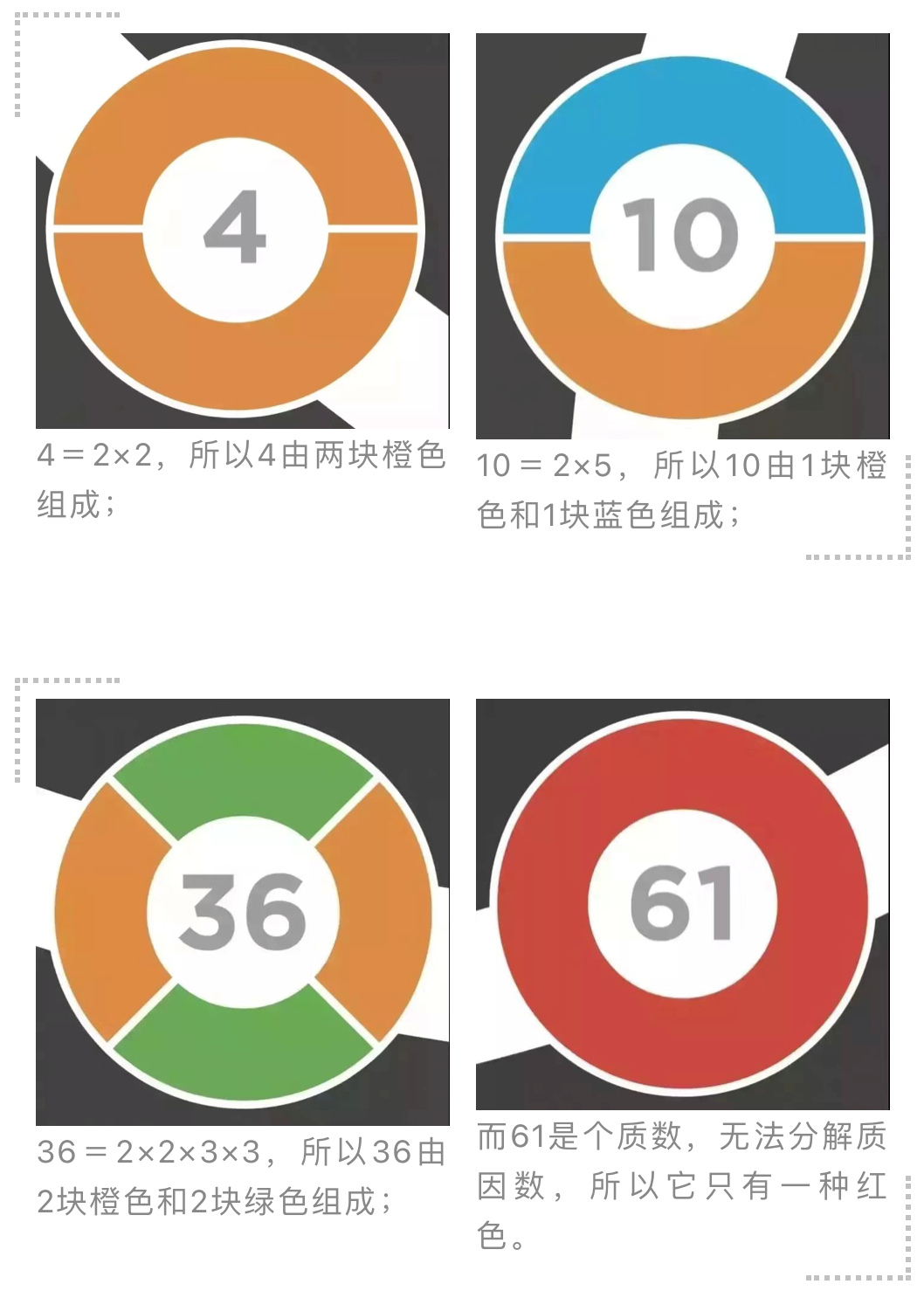 只看第一行,你能不能推断出21的颜色是什么样的? 观察一下,偶数有什么共同点? 8和4同样是用到了橙块,为什么分割区域不同? 。。。