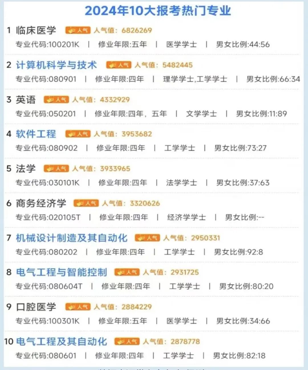 相比较去年的热门榜,今年排名第一的依旧是临床医学专业,而计算机科学与技术专业和英语专业排名也上升到了今年的第二、第三名。