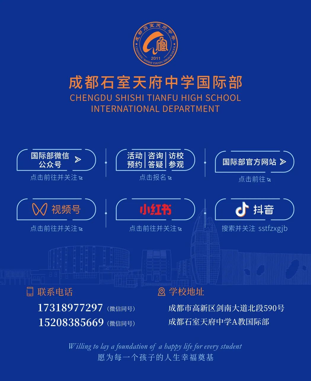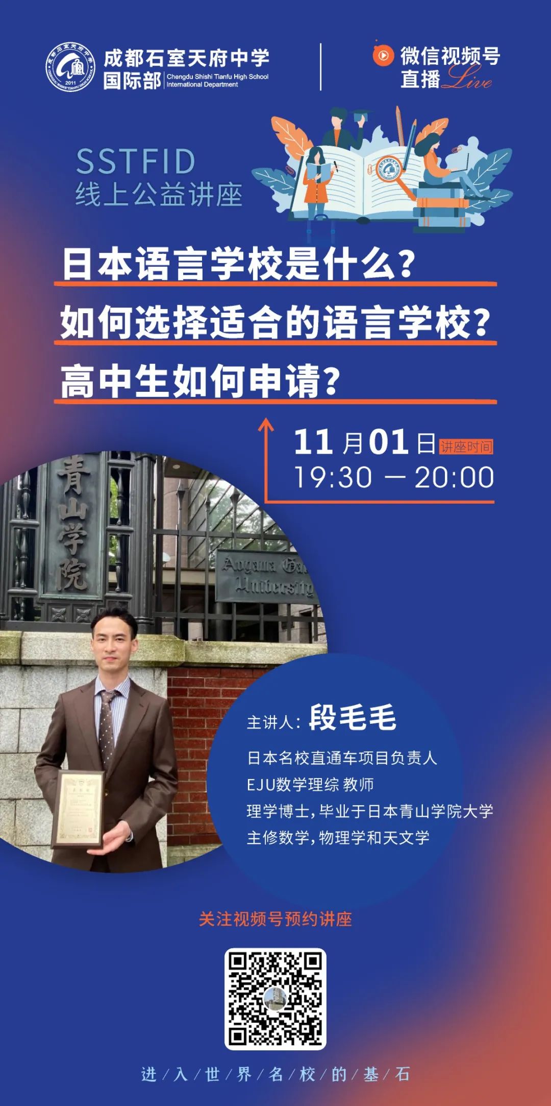 石室天府国际部在每学期开设了系列线上公益直播讲座,欢迎每一位对国际教育感兴趣的家长扫码报名!