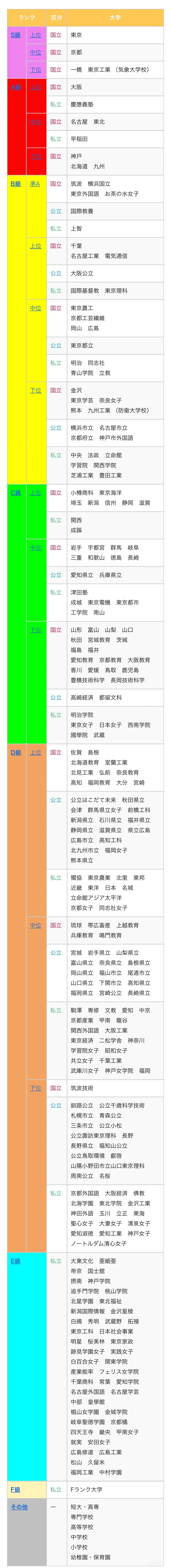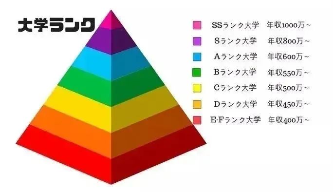 不过,在日本民间经常会出现S-F级的等级划分法,这个等级是参考各大学学部·学科的平均偏差値以及最高偏差值,以及大学的传统影响力、就职情况等划分的,各等级大学年收入情况如下: