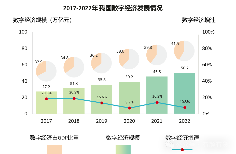 2017年~2022年中国数字经济发展情况中国高度重视数字经济对社会发展贡献的巨大潜能。在全国网络安全和信息化工作会议、党的二十大等重要会议上多次提出,要发展数字经济、加快推动产业数字化。在全球数字经济发展的时代背景下,数字化转型正在改变企业和行业的运行规律,从数字原生企业到传统企业都在积极探索数字化转型。- 数字原生企业通过新一代信息技术的深入运用,提升产品和服务的竞争力,以实现企业自身的跨越式发展。某些数字原生企业(如初创企业和互联网企业)正在对传统的市场规则和边界产生冲击。这些企业以更加密集的资本投入、更强有力的客户关系、更加敏捷的运营体系和更加个性化的品牌,获得更广泛的优势,打破传统企业几十年积累的运营优势。