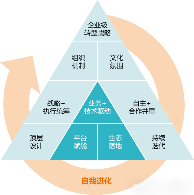 贯彻3个核心原则:将核心原则贯穿转型全过程,保证转型始终在正确的轨道上。- 数字化转型过程中,战略与执行并重。战略强调自上而下,重视顶层设计,从企业战略逐层解码。找到行动的目标、路径,指导具体的执行。执行强调自下而上,在大致正确的方向指引下,积极进行基层探索和创新,将新技术和具体的业务场景结合起来,从而找到价值兑现点。从成功的基层创新、归纳和总结经验,反过来影响和修订上层的战略和解码。战略与执行统筹,处理好远期与近期、总体与局部、宏观与微观等各方面的关系。