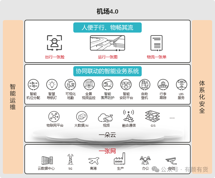 数字化转型的“1234”方法华为一直致力于借助自身在ICT技术上的领先优势,帮助各行业开展数字化转型,已积累了诸多成功经验,以下是几个典型案例的简要介绍。某大型枢纽机场为了满足2030年旅客吞吐量9000万人次、货邮吞吐量上百万吨、飞机起降60万架次的业务目标,新建航站楼的IT网络基础设施要高标准、高要求进行建设。对标业界一流国际机场,建设完善的高可靠网络,保障机场业务稳定运行。通过采用华为智慧机场网络解决方案,构建新型IT架构,推进产业数字化发展和创新,服务集团高质量发展,打造具有国际影响力的一流机场。