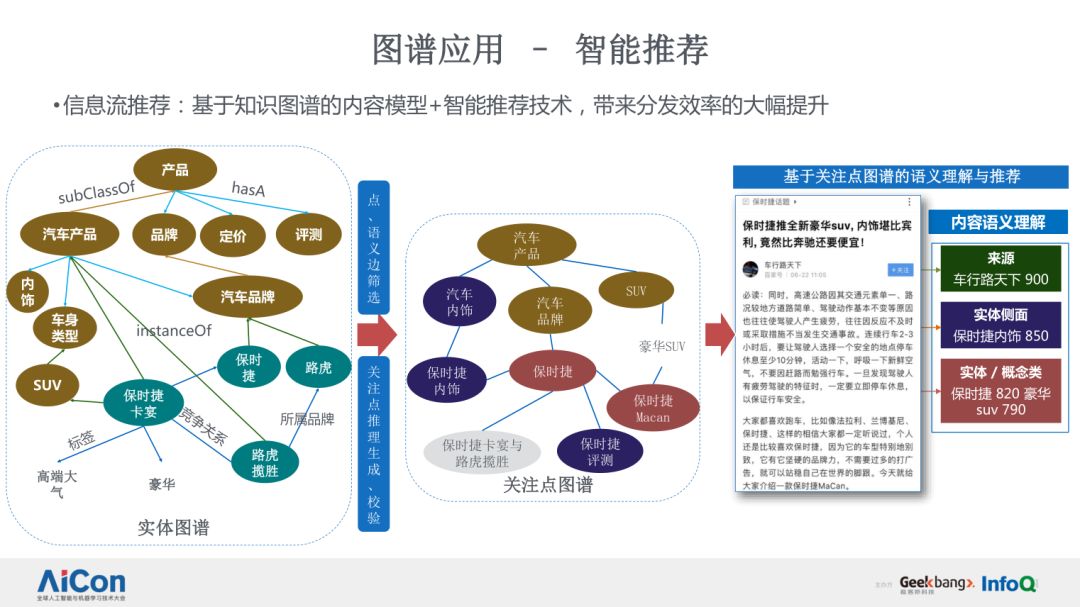 第三个层面,就是知识图谱应用在 Feed 信息流推荐场景中。在这个场景中,基于知识图谱的内容模型和智能推荐技术,Feed 文章的分发效率有了极大的提升。基于知识图谱的语义关联,我们构建了一个大规模的关注点图谱,通过点、边语义筛选,以及推理生成校验,生成关注点图谱,文章背后蕴含的内容关联,以及知识的联系,通过关注点图谱被链接起来。基于知识图谱增强的推荐,传统的智能推荐具备了更强的知识关联特性,同时推荐的可解释性和效果也得到了大幅度的提升。