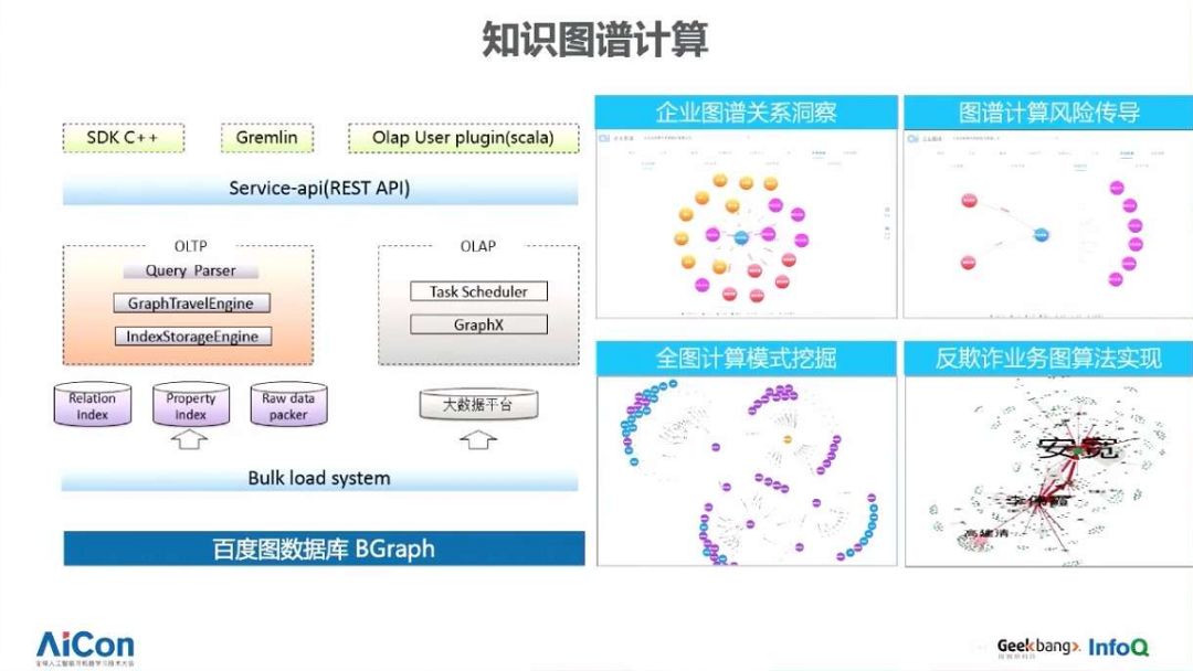 我刚刚提到了计算挖掘和推理是目前行业对于知识图谱需求非常大的一个点,是超越了简单问答等等一系列浅层应用的点。比如在金融行业,我们有大量的交易数据、投资数据,我们可以从这些数据里面去挖掘出有价值的信息,将其应用在反欺诈、风险控制和智能营销这些领域。这些应用会依赖一个基于图表示的计算分析引擎 --- 图数据库。百度 BGraph 就是这样一个拥有自主知识产权的大规模高性能原生图数据库。