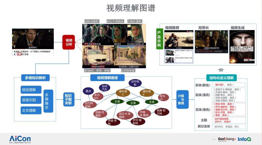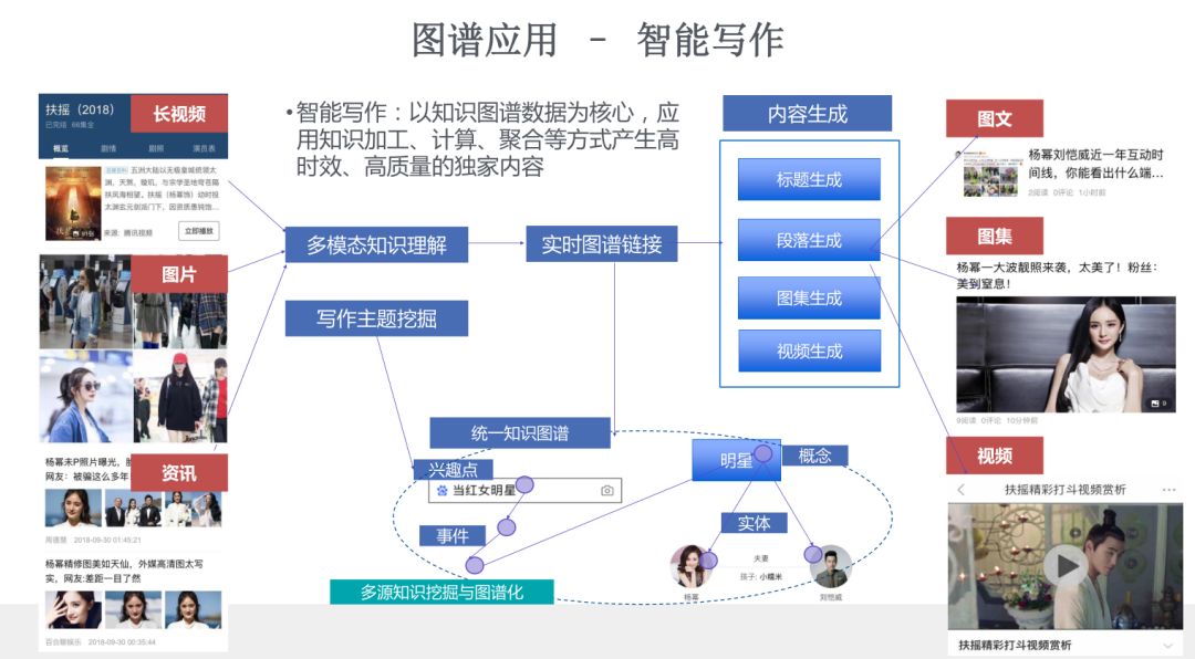 上图左边是我们在该方向的技术栈的一个视图,包括了最底层的多模分析,这个多模分析是基于百度多模分析部门,分析出来的多模结果,我们在上层建立了基于知识图谱的语义理解的基础技术,包括视频内容模型、跨媒体生成、知识解析、子图关联、视频子图关联还有推理计算等。