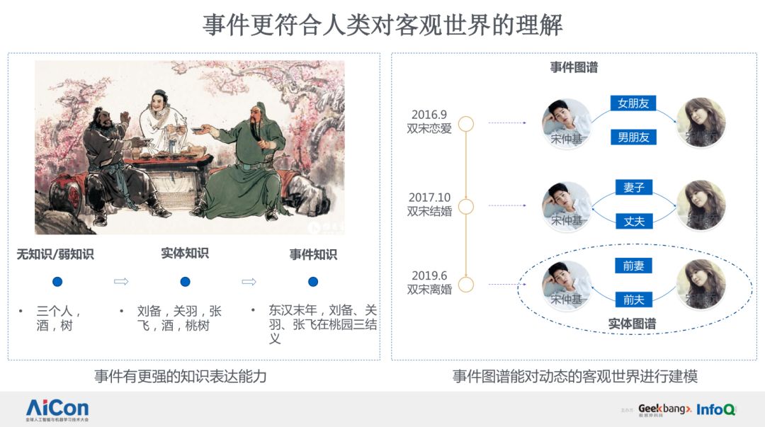 上图展示的是一个历史领域的事件图谱示例。最左边这个图,表明了事件图谱具有更强的知识表达能力。同样的一幅国画,在没有知识或者弱知识的情况下,我们能够认知到这幅图画所蕴含的内容是三个人,有酒、有树,这对于 OCR 和图片识别来说已经算是个好的成果了。有了实体知识,也就是通用知识图谱后,我们对这幅画的理解程度就会加深,我们可以知道这里面描述的是刘备、关羽和张飞这三个人,这里面有酒、还有桃树。有了事件知识图谱,我们就能够知道,这描述的是在东汉末年,刘、关、张三人在桃园里三结义的故事。事件图谱持续、快速地获取客观世界中所发生的事件,并且挖掘事件的属性,建立事件在空间和时间纬度上的联系,进而来构成以事件为基本单位的知识网络。同时,在任意一个时刻,事件图谱都能够和实体图谱,也就是通用的 SPO 三元组图谱来形成一个映射,事件图谱和实体图谱之间是可以相互推断的。我们认为事件图谱具有更强的知识表达能力,能够对客观世界进行更好地建模。