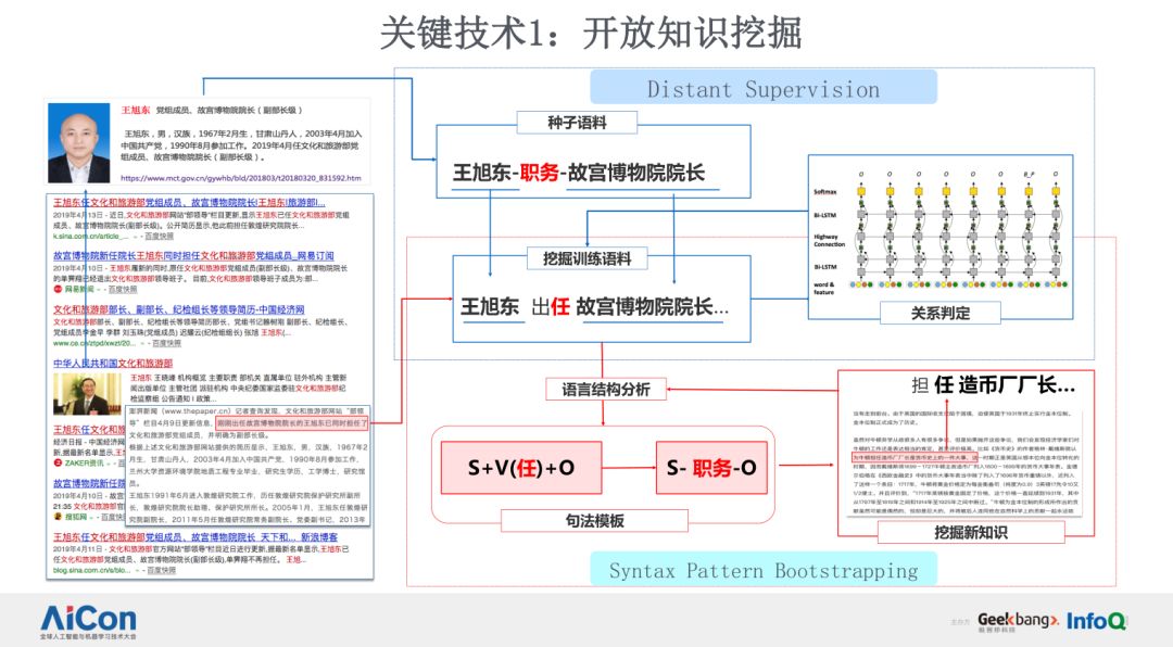 首先,我们来讲讲开放海量数据构建大规模知识图谱这个技术 Topic。在大数据时代知识图谱技术需要处理的数据量级、百亿级、千亿级都非常常见,领域开放给我们带来的最大的挑战是什么?是数据结构复杂、知识表达多样、图谱关系也很复杂、计算性能要求高等等。面向开放互联网,我们研发了基于主动学习的大规模知识图谱构建技术,包括了以下几个层面:首先是基于远监督学习的开放知识抽取,来解决无标签、开放知识挖掘的问题;第二个方面是基于属性聚合的本体半自动构建,因为我们知道通用知识图谱所涵盖类目是非常多的,很难用专家的方式自顶向下地去描述整个客观世界知识图谱的本体和它的属性和关系的体系,必须要用数据驱动的方式完成在通用海量的数据上做本体构建的工作;第三个层面就是对多元的数据进行知识整合、融合。