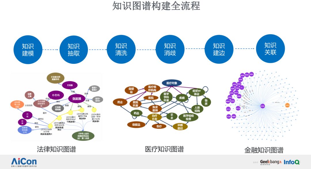 下图是我们行业知识图谱构建的全流程,包括了知识建模、抽取、清洗、消歧、建边和关联,这里面列举了现在我们重点关注的三个行业:法律知识图谱、医疗知识图谱和金融知识图谱。