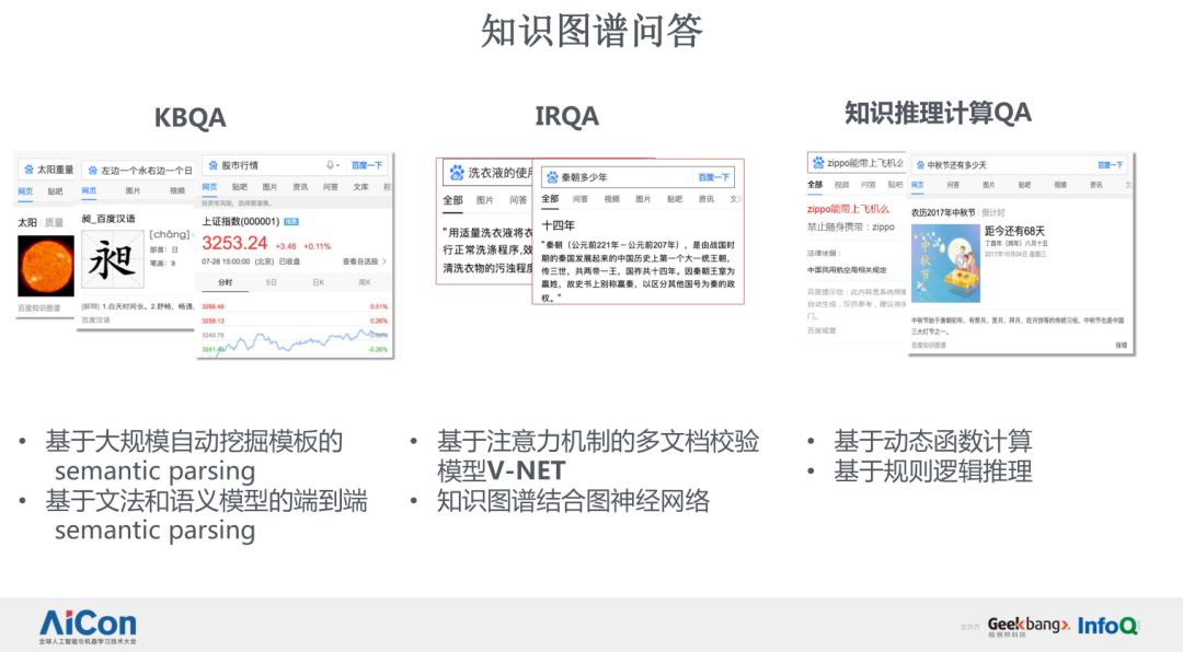 最后我们讲一下知识图谱问答。知识图谱问答在行业上面分了三种技术,去满足行业对于知识图谱的问答需求。第一部分就是 KBQA,它是基于知识图谱结构化数据的问答技术,主要是用两种 semantic parsing 技术去解决行业知识图谱问答问题。第二部分是 IRQA,也就是是阅读理解 QA,第三部分是知识推理计算型 QA。通过这三种 QA,我们在行业知识库、行业智能客服等多个场景中都取得了非常好的 QA 效果。