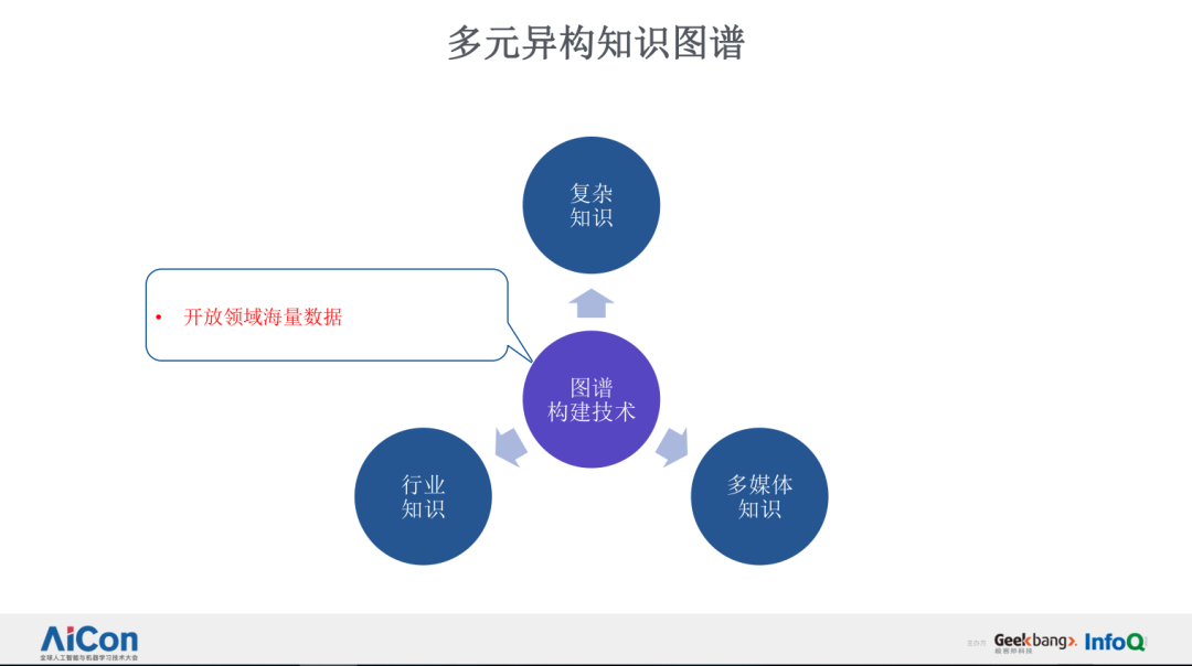 第一个技术 Topic 是近两年我们重点解决的一个问题——多元异构图谱的构建。它主要解决的问题是我们如何在一个开放、海量数据的互联网环境下,去构建千亿级事实和关系的知识图谱;知识图谱里面包含的所有内容是否就是简单的 SPO 三元组,我们是否需要将更多复杂的知识来引入到我们的知识图谱数据中;我们怎么去理解和构建多媒体知识以及行业知识等等。