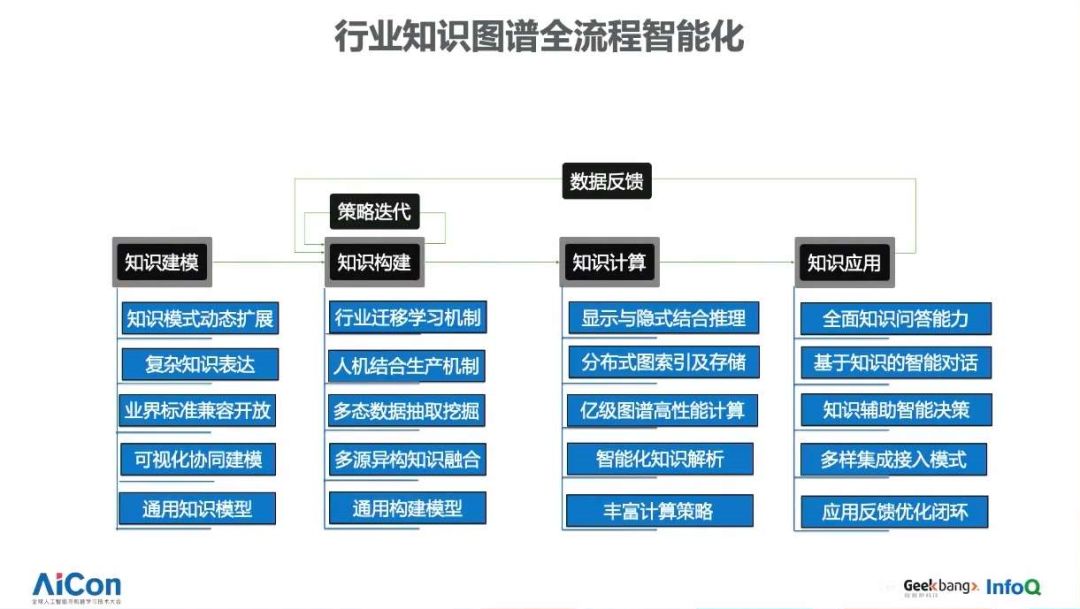 上图是我们知识图谱全流程智能化的简要视图,从知识建模、到知识构建,再到知识计算和知识应用,我们在每一个环节都有自己的关注点。比如在知识建模这个层面,我们会重点关注知识模式的动态扩展、行业复杂知识表达、行业与业界标准的兼容开放、可视化协同建模,以及我们会将通用知识模型引入和内置到行业知识图谱的表达过程中。