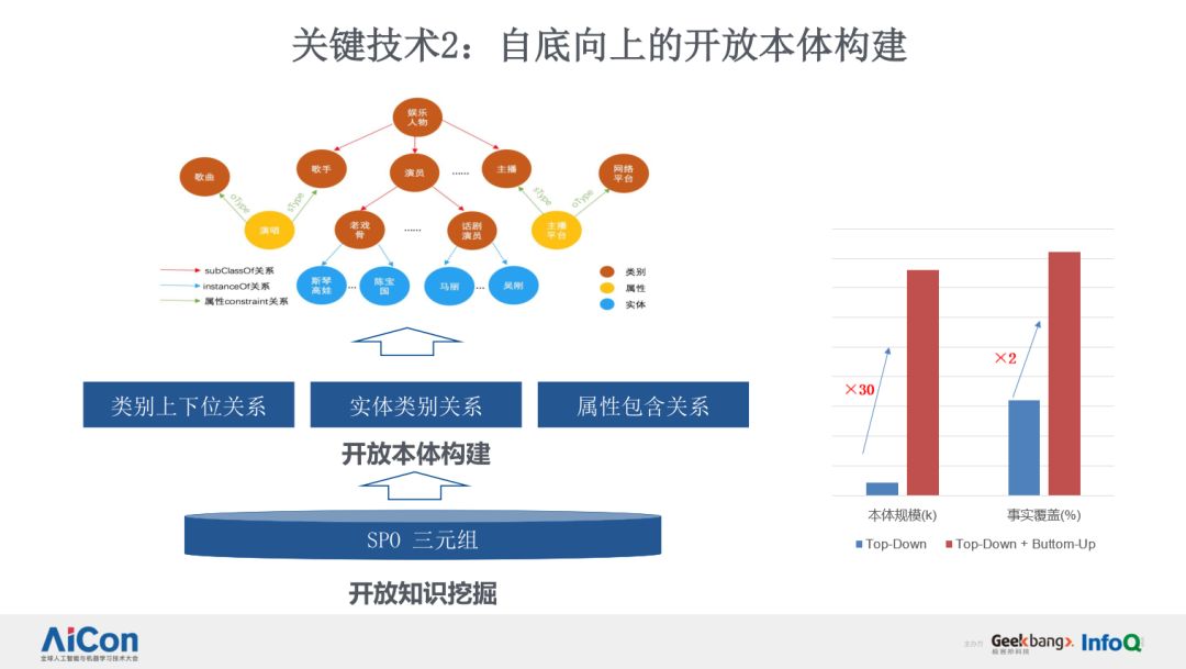 基于以上技术,百度通用知识图谱的数据规模扩大了几个量级,并且显著提升了在搜索场景下知识图谱的覆盖度和建设效率。关键技术涵盖了开放知识挖掘、自底向上的开放本体构建、基于多源数据的知识整合。具体内容如下图所示: