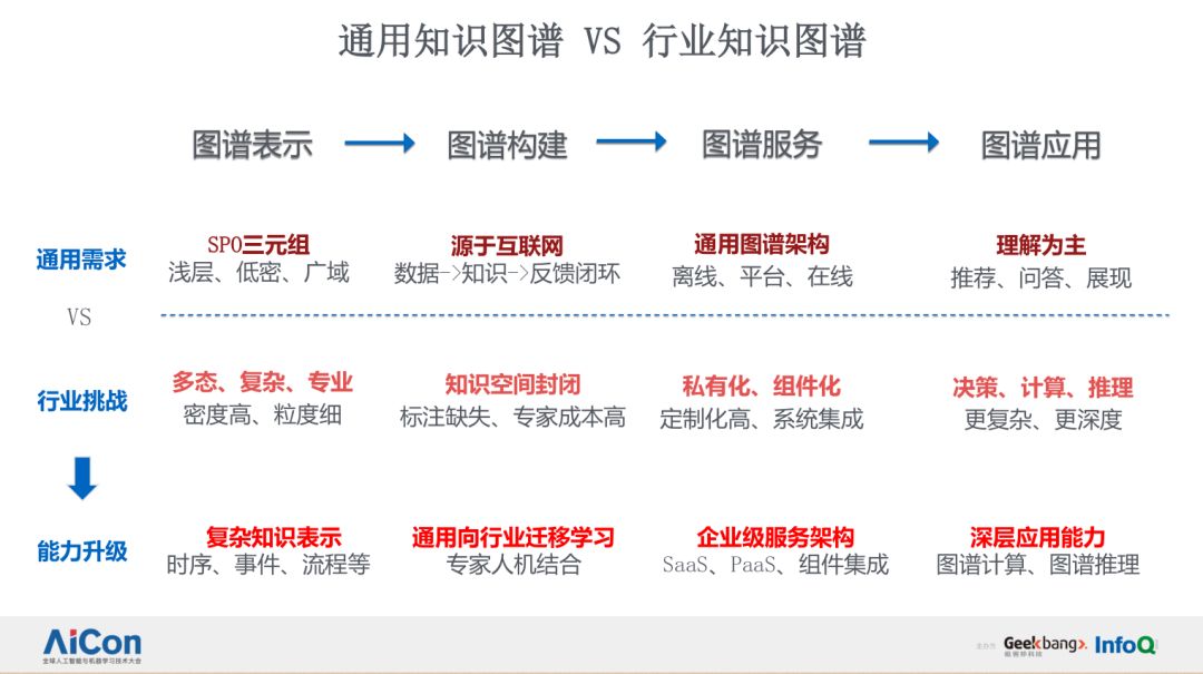 这里面列举了我们过去两年总结出来的通用知识图谱技术和行业知识图谱技术的不同,也正是基于这些不同,我们建立了一套行业知识图谱构建与应用的技术体系。具体而言,我们认为,行业知识图谱和通用知识图谱在下面四个维度有着很大不同,这四个维度也是知识图谱从表示、构建、到服务和应用的四个全周期维度。