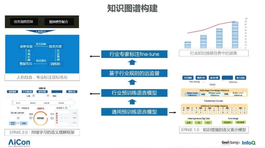 首先第一个问题是行业知识图谱构建时我们面临的最大挑战——知识理解冷启动的问题。在百度内部知识图谱构建,理解算法层面,我们有大量的互联网语料,我们有基于用户点击贡献的海量标注,这些信息帮助我们在通用领域将算法推到一个比较好的效果上。在行业内,一般标注数据会缺失,专家标注的人力成本又非常高,为了解决上述问题,我们在行业应用过程中遵循一个范式去解决行业语料冷启动问题。上图展示了这个范式的大致流程。