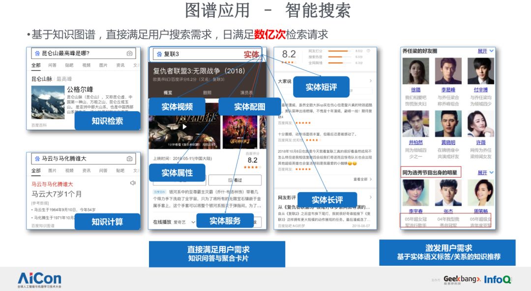 首先是智能搜索。截止到目前,百度智能搜索的首位满足率已经达到 57%,这个是在 Robin 最新财报里面披露的一个数字。背后是基于百度最新的人工智能技术的加持,这其中 20% 左右是由百度知识图谱的技术直接支持的。基于知识图谱,我们直接满足用户的搜索需求,目前每天平均满足数亿次的检索请求,其表现形式包括了各种形态的知识图谱问答卡片以及对实体各个维度进行信息聚合的知识大卡,这是知识图谱在百度搜索首位直接给大家带来的智能化体验。