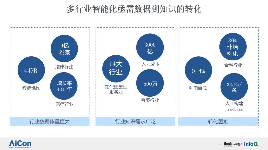 海量数据的知识化转化是目前众多行业所面临亟待解决的问题。我这里面列举了一些数字,用来说明几个特性:一、行业数据体量巨大;二、行业知识需求广泛;三、行业知识转化困难。根据一项权威分析报告显示,到 2020 年,我们整个行业里所积累的数据体量将从 2015 年的 5ZB,上升到 2020 年的 44ZB。具体到行业内部,比如法律行业,每年会产生 4 亿份卷宗,医疗行业,每年数据的增长率达到了 48%,也就是说我们现在正处在一个数据爆炸的时代。怎么利用这些数据更好地提升行业的智能化应用水平,是我们一直在思考的问题。