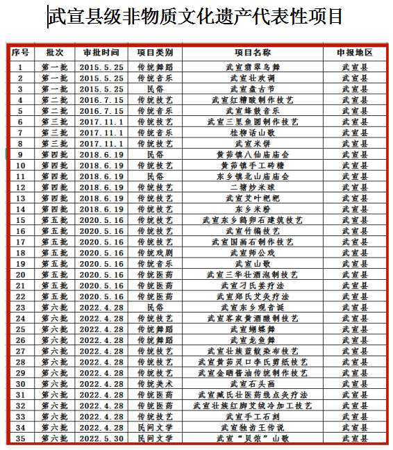 武宣目前没有国家级非物质文化遗产代表性项目,区级非物质文化遗产代表性项目12个,市级非物质文化遗产代表性项目23个,县级非物质文化遗产代表性项目35个。
