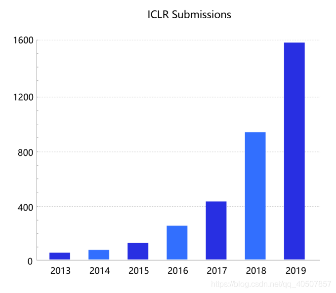 虽然历史悠久,但深度学习在今天依然在蓬勃发展,一方面基础研究快速发展,另一方面工业实践层出不穷。基于深度学习的顶级会议ICLR(International Conference on Learning Representations)统计,深度学习相关的论文数量呈逐年递增的状态,如 图9 所示。同时,不仅仅是深度学习会议,与数据和模型技术相关的会议ICML和KDD,专注视觉的CVPR和专注自然语言处理的EMNLP等国际会议的大量论文均涉及着深度学习技术。该领域和相关领域的研究方兴未艾,技术仍在不断创新突破中。