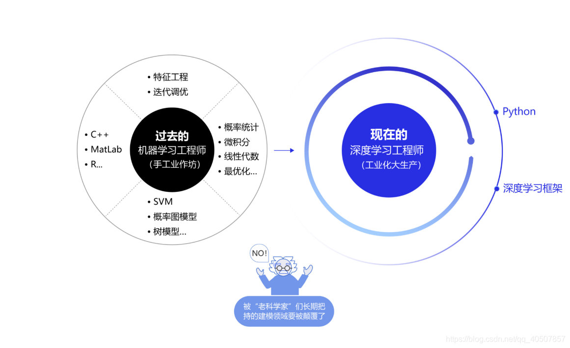 在深度学习框架出现之前,机器学习工程师处于手工业作坊生产的时代。为了完成建模,工程师需要储备大量数学知识,并为特征工程工作积累大量行业知识。每个模型是极其个性化的,建模者如同手工业者一样,将自己的积累形成模型的“个性化签名”。而今,“深度学习工程师”进入了工业化大生产时代。只要掌握深度学习必要但少量的理论知识,掌握Python编程,即可在深度学习框架上实现非常有效的模型,甚至与该领域最领先的模型不相上下。建模这个被“老科学家”们长期把持的建模领域面临着颠覆,也是新入行者的机遇。
