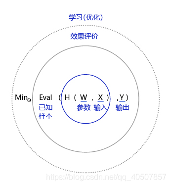 图3 是以为模型的假设,它是一个关于参数和输入的函数,用 表示。模型的优化目标是的输出与真实输出尽量一致,两者的相差程度即是模型效果的评价函数(相差越小越好)。那么,确定参数的过程就是在已知的样本上,不断减小该评价函数( 和相差)的过程,直到学习到一个参数,使得评价函数的取值最小。这个衡量模型预测值和真实值差距的评价函数也被称为损失函数(损失Loss)。