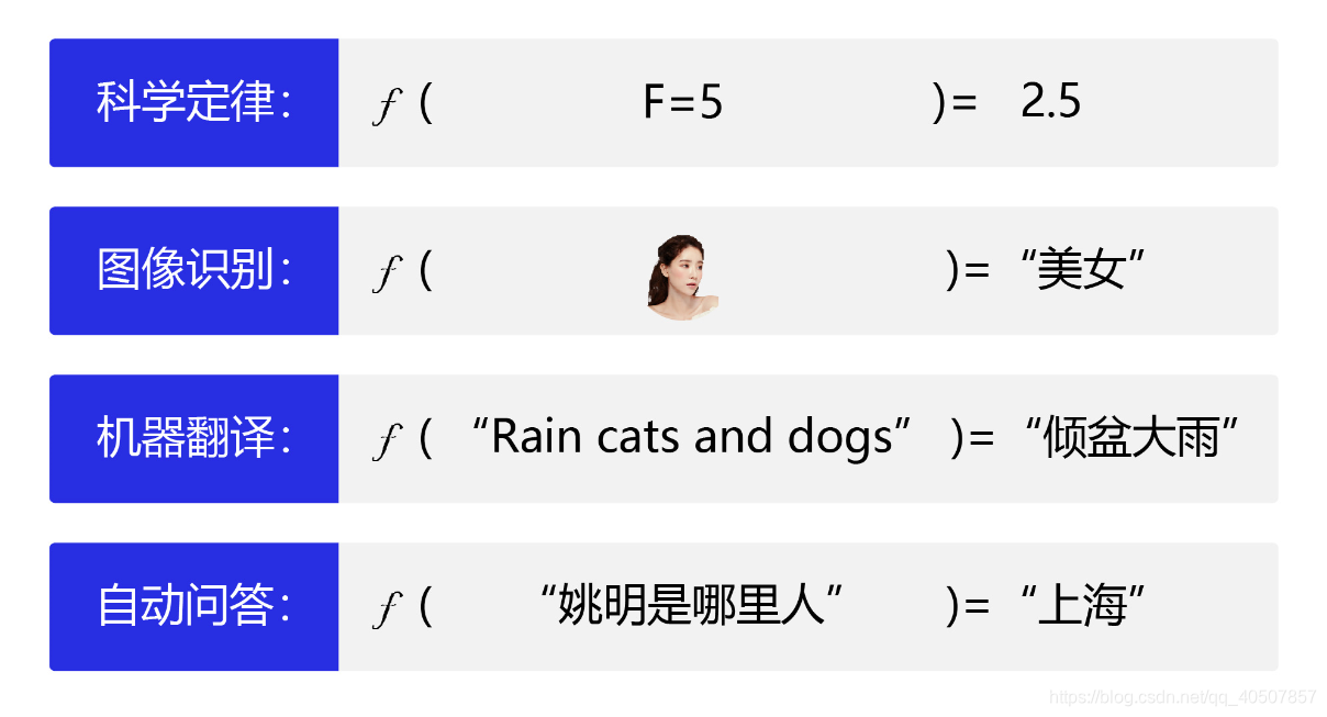 机器执行学习的框架体现了其学习的本质是“参数估计”(Learning is parameter estimation)。在此基础上,许多看起来完全不一样的问题都可以使用同样的框架进行学习,如科学定律、图像识别、机器翻译和自动问答等,它们的学习目标都是拟合一个“大公式”,如 图5 所示。