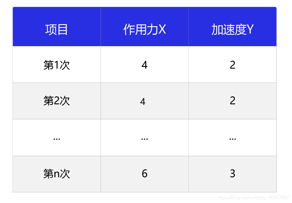 观察实验数据不难猜测,物体的加速度和作用力之间的关系应该是线性关系。因此我们提出假设 ,其中,代表加速度,代表作用力,是待确定的参数。