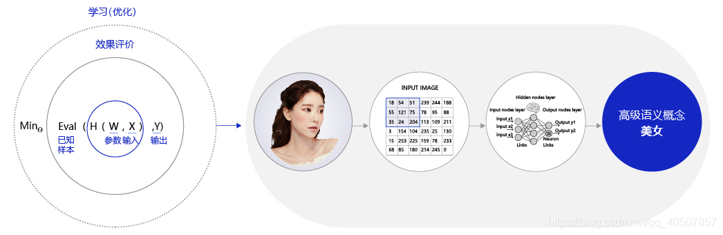 那么相比传统的机器学习算法,深度学习做出了哪些改进呢?其实两者在理论结构上是一致的,即:模型假设、评价函数和优化算法,其根本差别在于假设的复杂度,如 图6 所示。