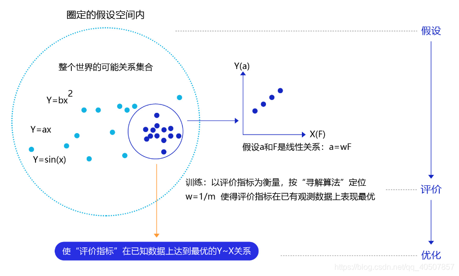 从上述过程可以得出,机器学习的过程与牛顿第二定律的学习过程基本一致,都分为假设、评价和优化三个阶段:
