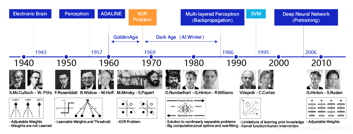 神经网络思想的提出已经是75年前的事情了,现今的神经网络和深度学习的设计理论是一步步趋于完善的。在这漫长的发展岁月中,一些取得关键突破的闪光时刻,值得我们这些深度学习爱好者们铭记,如 图8 所示。