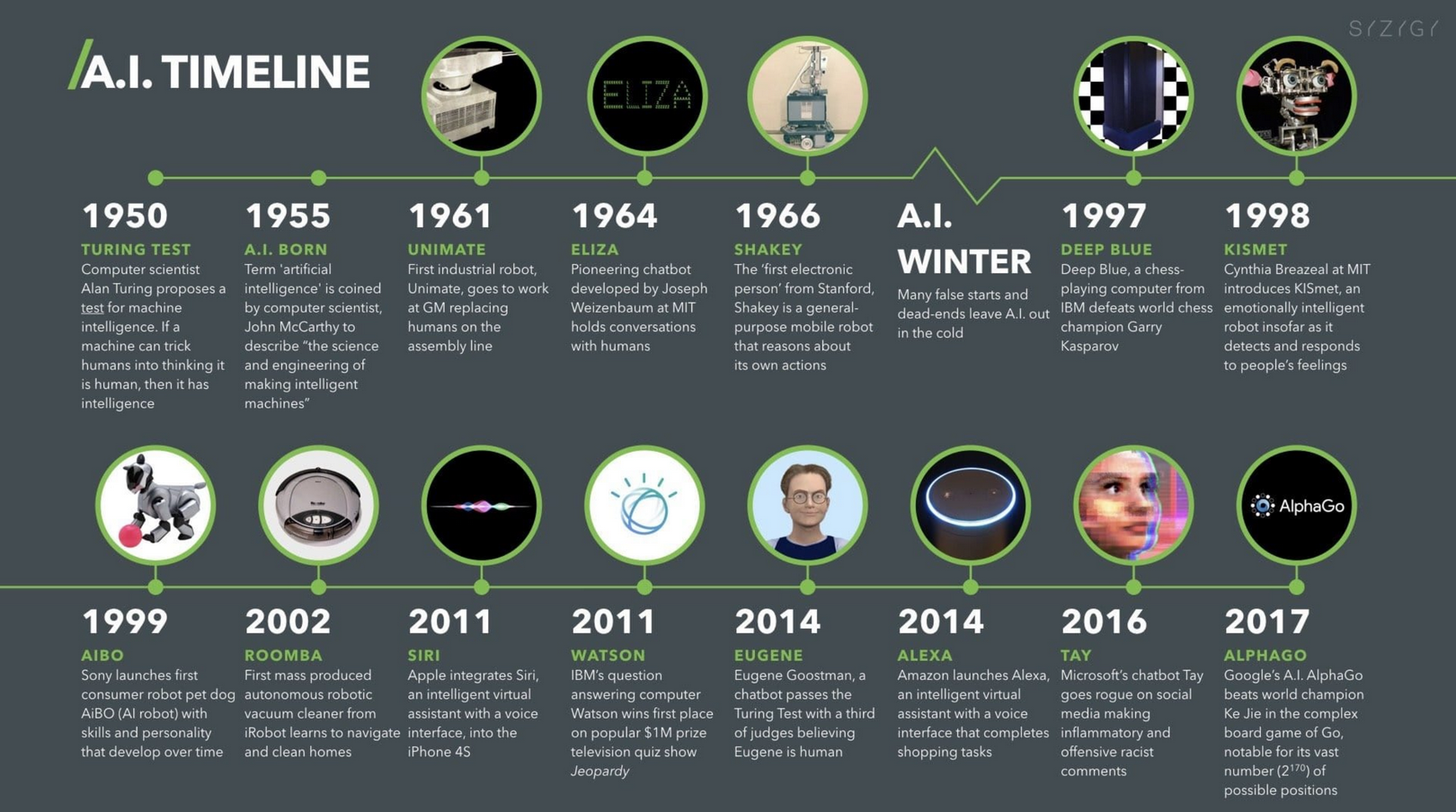 1997 深南战胜国际象棋冠军 2011 siri诞生 2012 深度学习开始(图像识别等) 2017 阿尔法狗