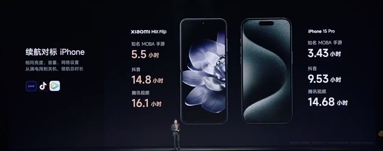 从发布会现场介绍的情况来看,小米这款小折叠确实有不少“黑科技”,如3.5寸的显示屏幕,空出的位置可以做智能悬窗、不需打开手机就能接打电话、外屏可支付等。另外,熟悉的对标iPhone环节也没有缺席。发布会现场,雷军从续航、游戏使用时长等方面对比了iPhone 15Pro。
